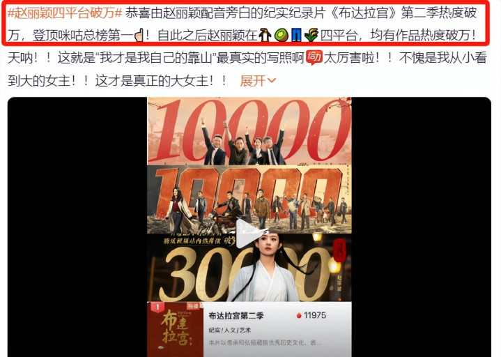 可不是嘛!先说她新配音的纪录片,播放量那是蹭蹭往上涨,好评如潮!好多人都被她那低沉温柔的声音给迷住了,感觉跟布达拉宫的气氛特别搭,简直绝了!这不,直接让她成了“四平台破万第一人”!这可是实打实的成绩,可不是吹的!你想想,一部剧火,演员火,平台也跟着火,多好啊!赵丽颖的剧,那可是从来没扑街过!别的明星都在暗戳戳地互相竞争资源,她倒好,跟各大平台合作的不要太愉快!为啥?因为人家实力硬,作品质量高,观众缘好!这才是硬道理!《与凤行》、《幸福到万家》、《风吹半夏》、《在人间》……随便拎出来一部,都是爆款!收视率、口碑那是双丰收,奖项拿到手软!这可不是我瞎说的,你看看数据就知道了!